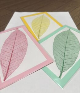 加工された天然の葉に好きな色を付けてメッセージカードを作ります。